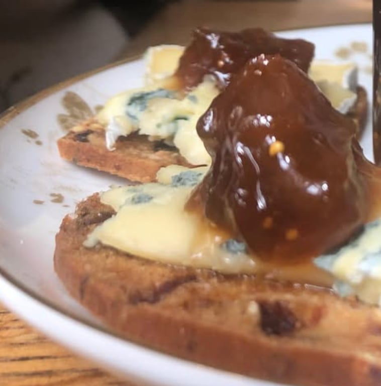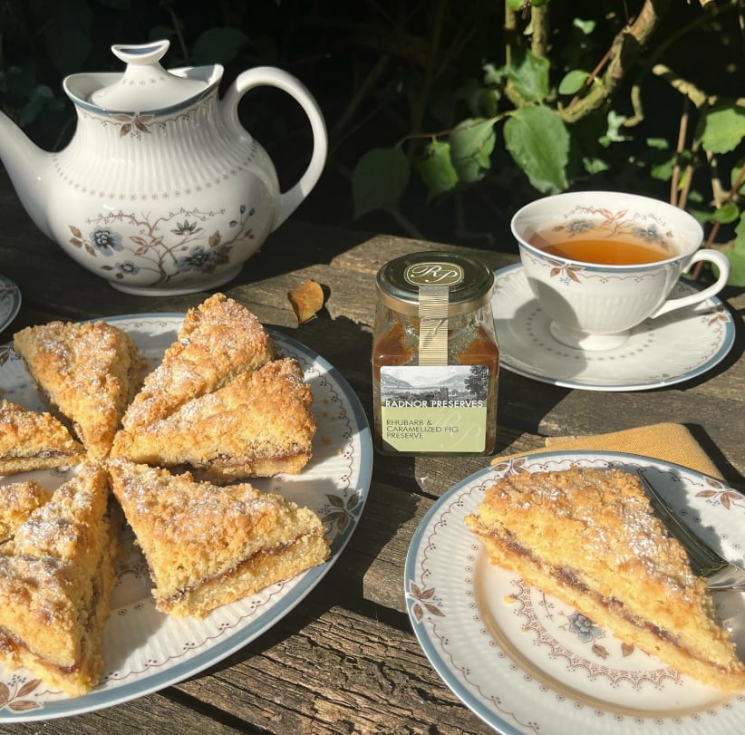 ルバーブとイチジクという素晴らしい組み合わせで、甘いもの、塩味の料理に合わせても楽しめます。朝食やお茶にもよく合いますが、上品なオーツビスケットの上に⻘かび系のチーズを乗せ、その上にチーズと同じくらいたっぷり乗せてお試しください。